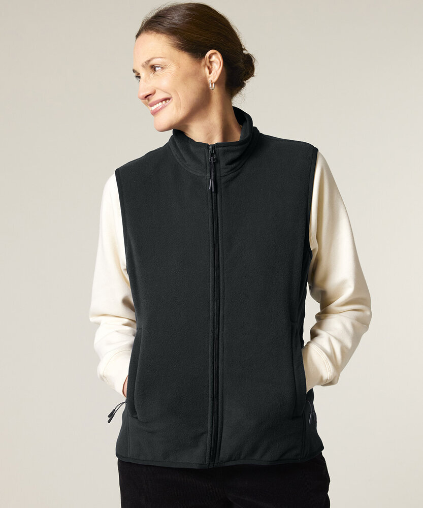 Sleeveless. Elastic binding at neck edge, armhole and hem. Inside back neck grosgrain loop. Nylon coil zip with metal zip pull and cord ending. Brushed fabric with anti-pilling finish on the inside and outside. Front side welt pockets with zip opening. Inside back neck tape in recycled polyester.