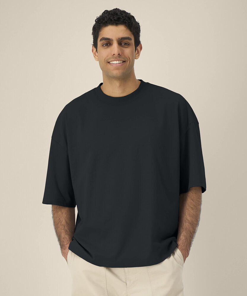 Unisex recycled cotton boxy t-shirt. Set-in sleeves. Forwarded shoulder seam. 1x1 rib at neck collar. Self-fabric back neck tape. Twin-needle topstitching at sleeve cuffs and hem.Contains 50% GRS-certified recycled cotton and 50% OCS-certified organic cotton, certified by Control Union CB-CUC-1393082.